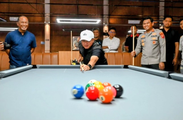 Pada kesempatan itu, Bupati Dian bersama Kapolres Kuningan turut mencoba fasilitas permainan biliar. Tampak kualitas meja biliar yang istimewa dan suasana interior yang nyaman.