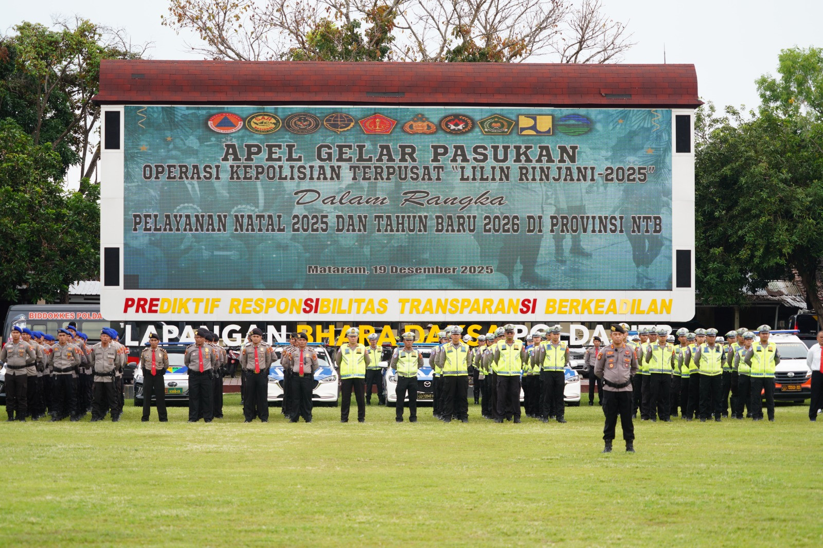 POLRI    Jumat 19 Desember 2025    21:39:11 WIBMataram, NTB - Kepolisian Daerah Nusa Tenggara Barat (Polda NTB) bersama Pemerintah NTB dan Stakeholder terkait melaksanakan Apel Gelar Pasukan Operasi Lilin Rinjani 2025 dalam rangka Pengamanan Natal tahun 2025 dan Tahun Baru 2026 di wilayah Nusa Tenggara Barat, Jumat (19/12/2025).