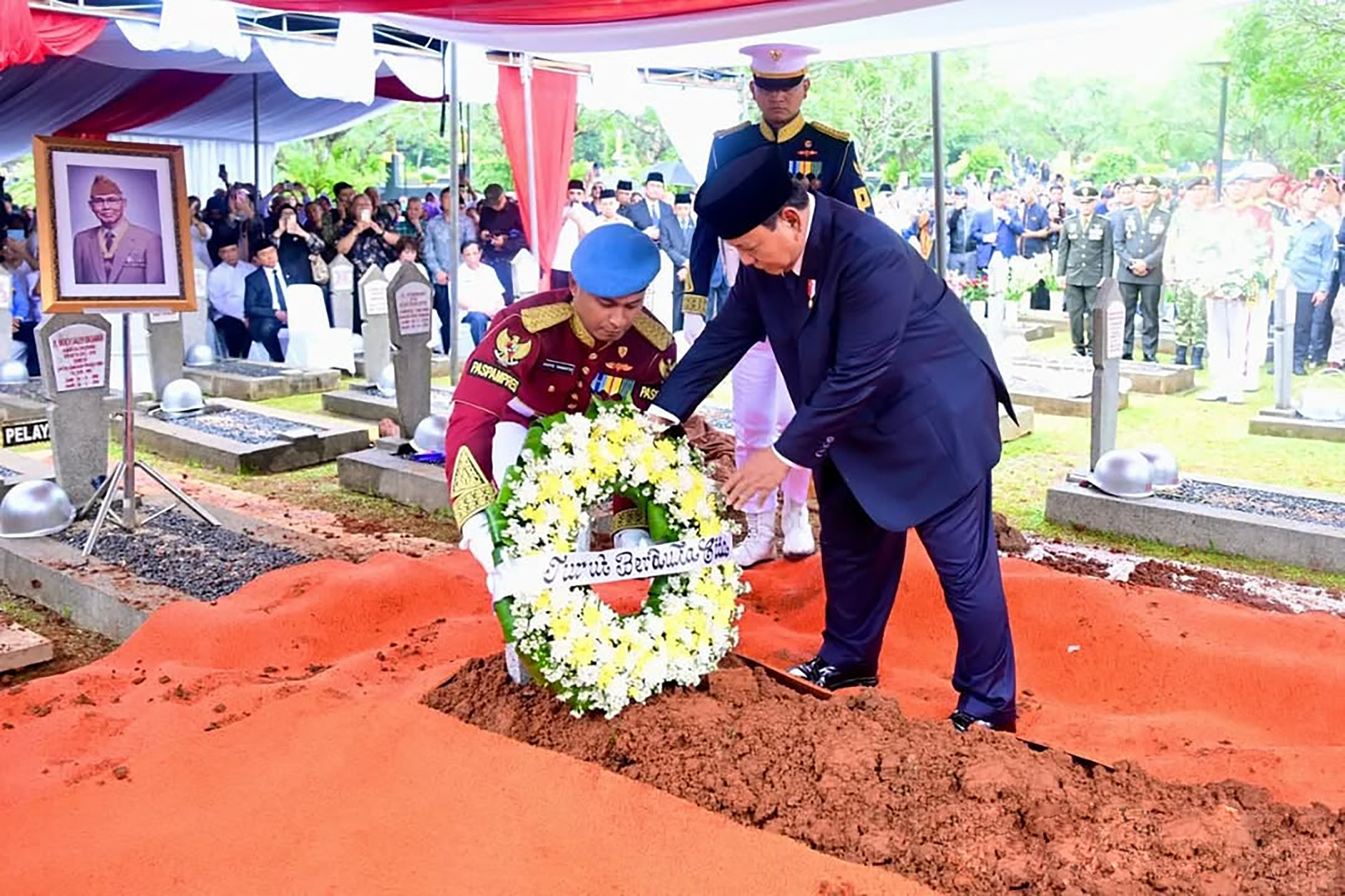 Upacara pemakaman dipimpin langsung oleh Presiden Republik Indonesia, Jenderal TNI (Purn) Prabowo Subianto, sebagai Inspektur Upacara. Prosesi diawali dengan penghormatan kepada arwah almarhum, dilanjutkan pembacaan riwayat hidup singkat, apel persada, serta penembakan salvo sebagai bentuk penghormatan militer terakhir.
